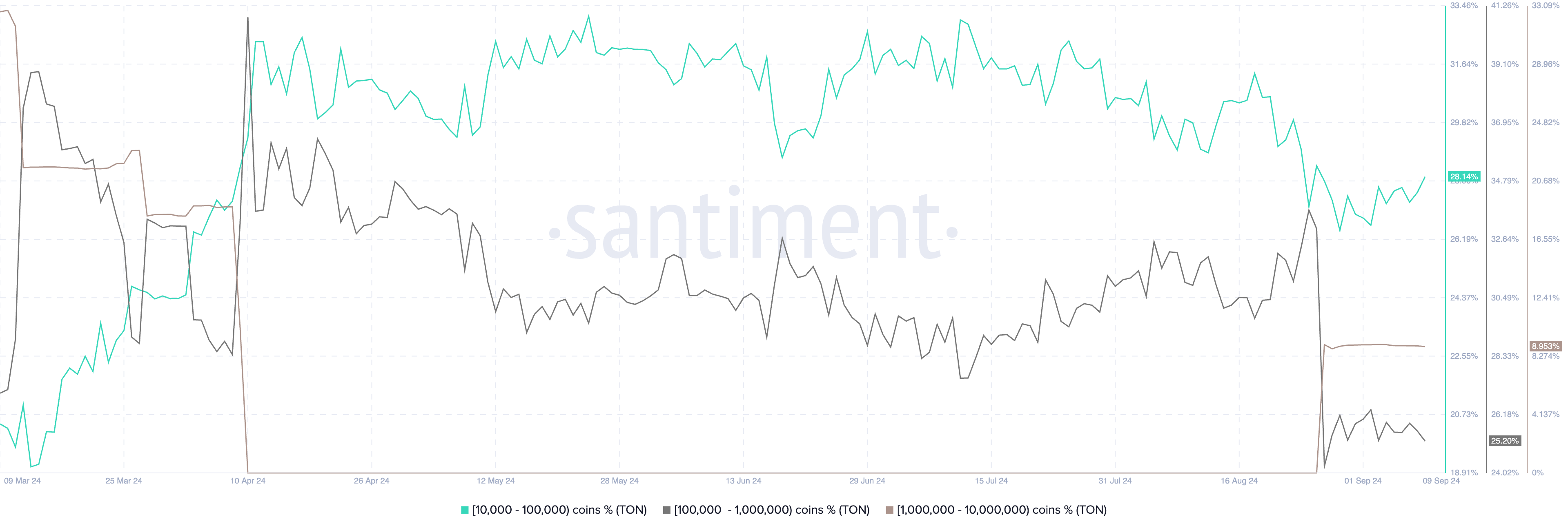 Ancak TON balinaları olumsuz haberlerden etkilenmemiş görünüyor. Santiment verileri, Durov'un tutuklanmasının ardından en zengin yatırımcılarının (token bakiyesi 10-100 milyon (kahverengi) olanlar) TON varlıklarında bir artış olduğunu ortaya koyuyor.